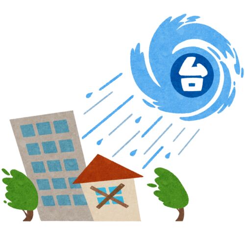台風の暴風雨で、建物や木が大きく揺れている様子を描いたフリーイラスト素材です。